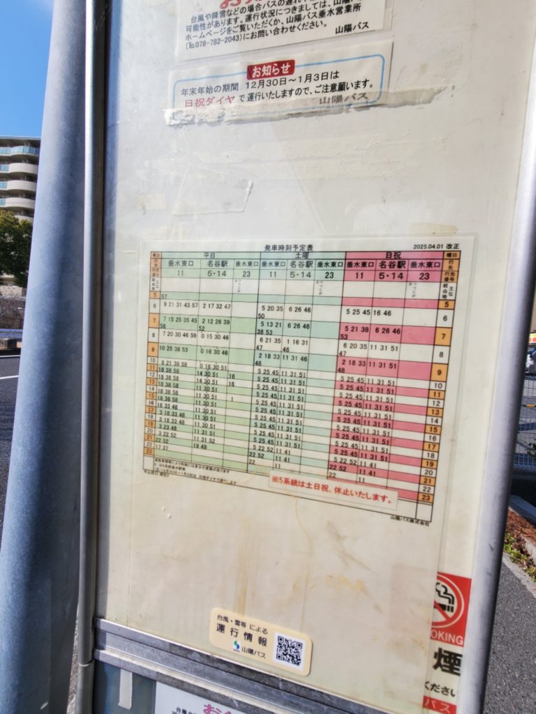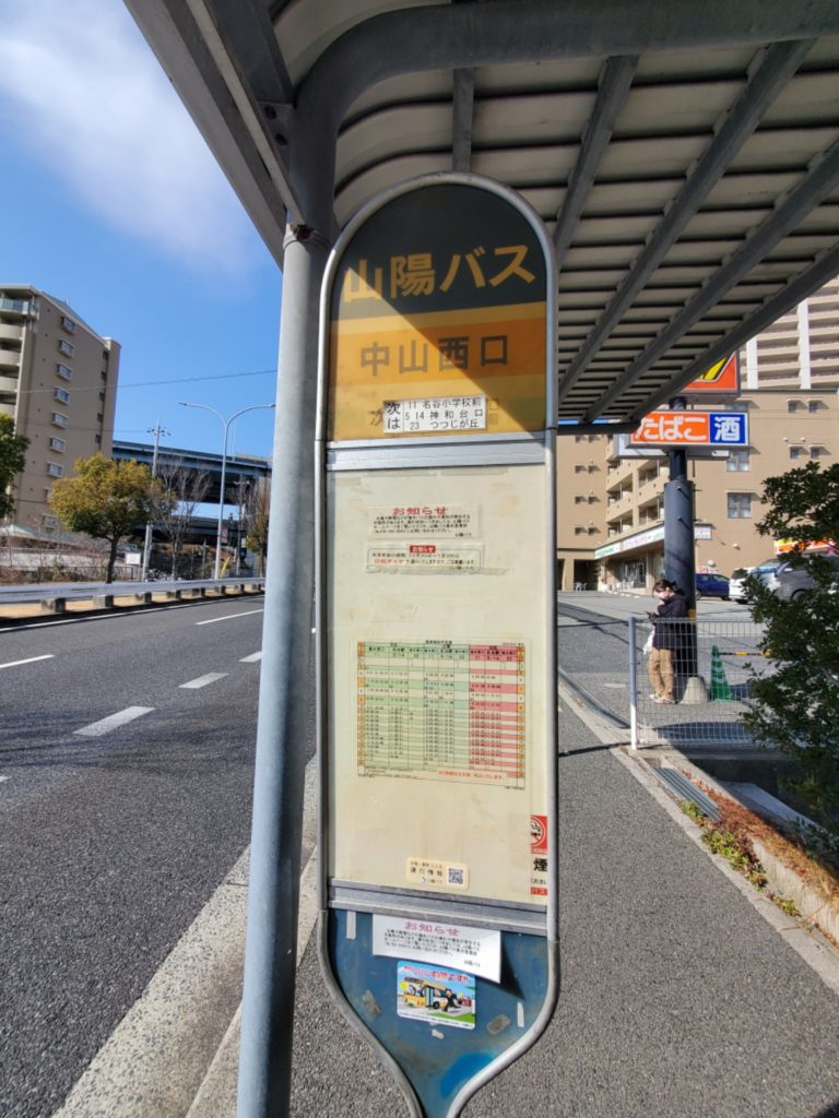 山陽バス「中山西口」ですね。時刻表をパチリ。ここからJR垂水駅東口、地下鉄名谷駅に行けるんですね!